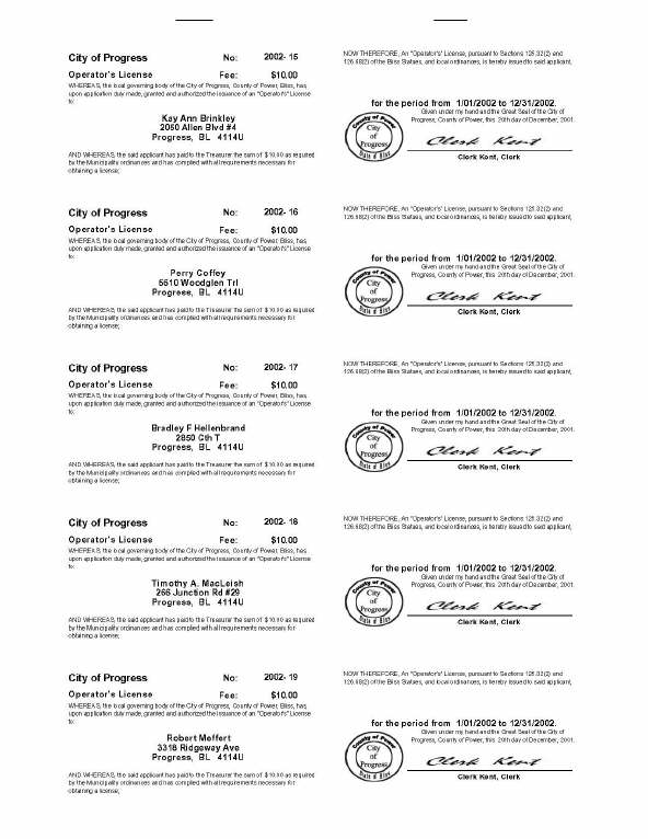 This format can be used for any single-fee License. There are 5 Licenses per page.Use Avery #5731 or equivalent.